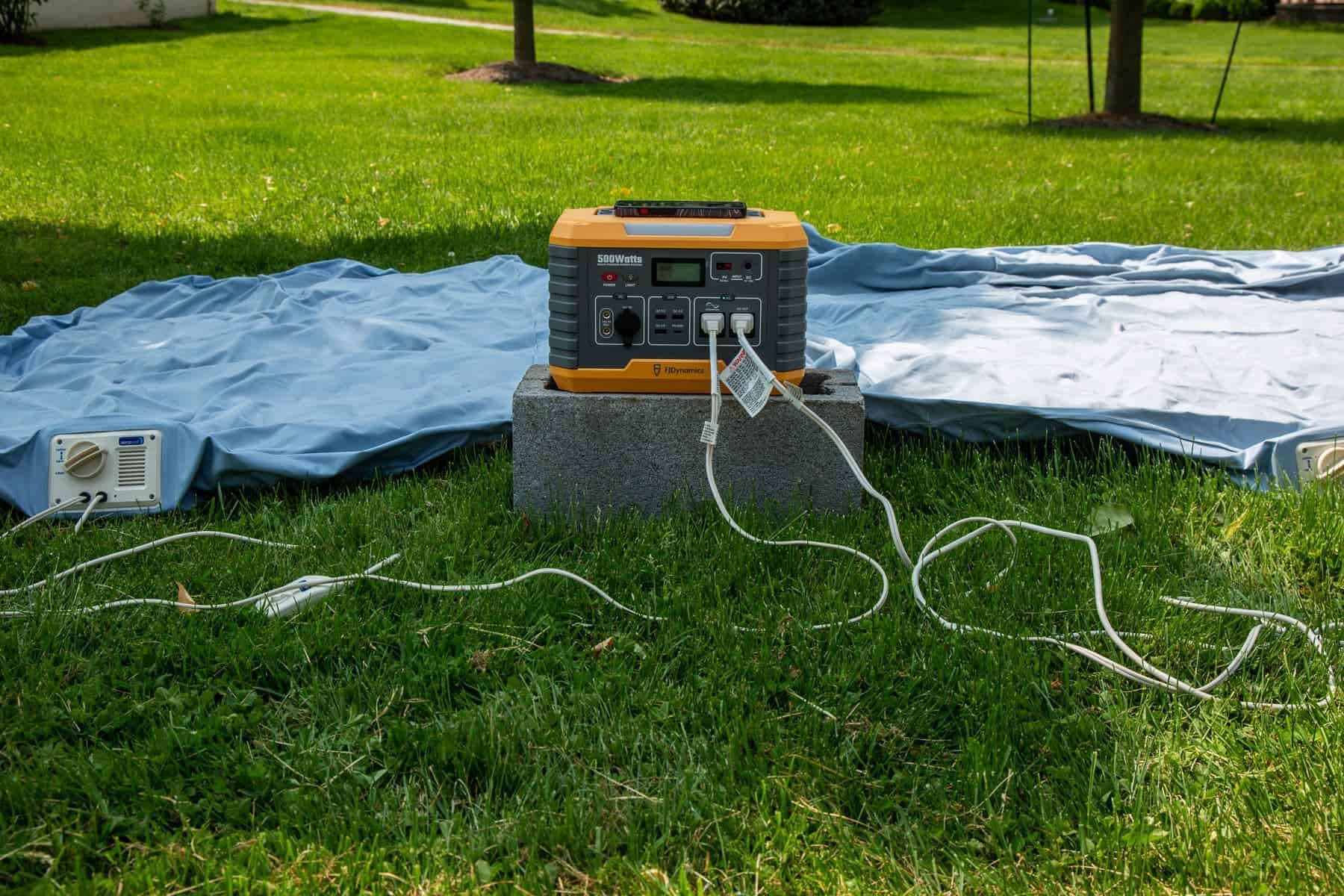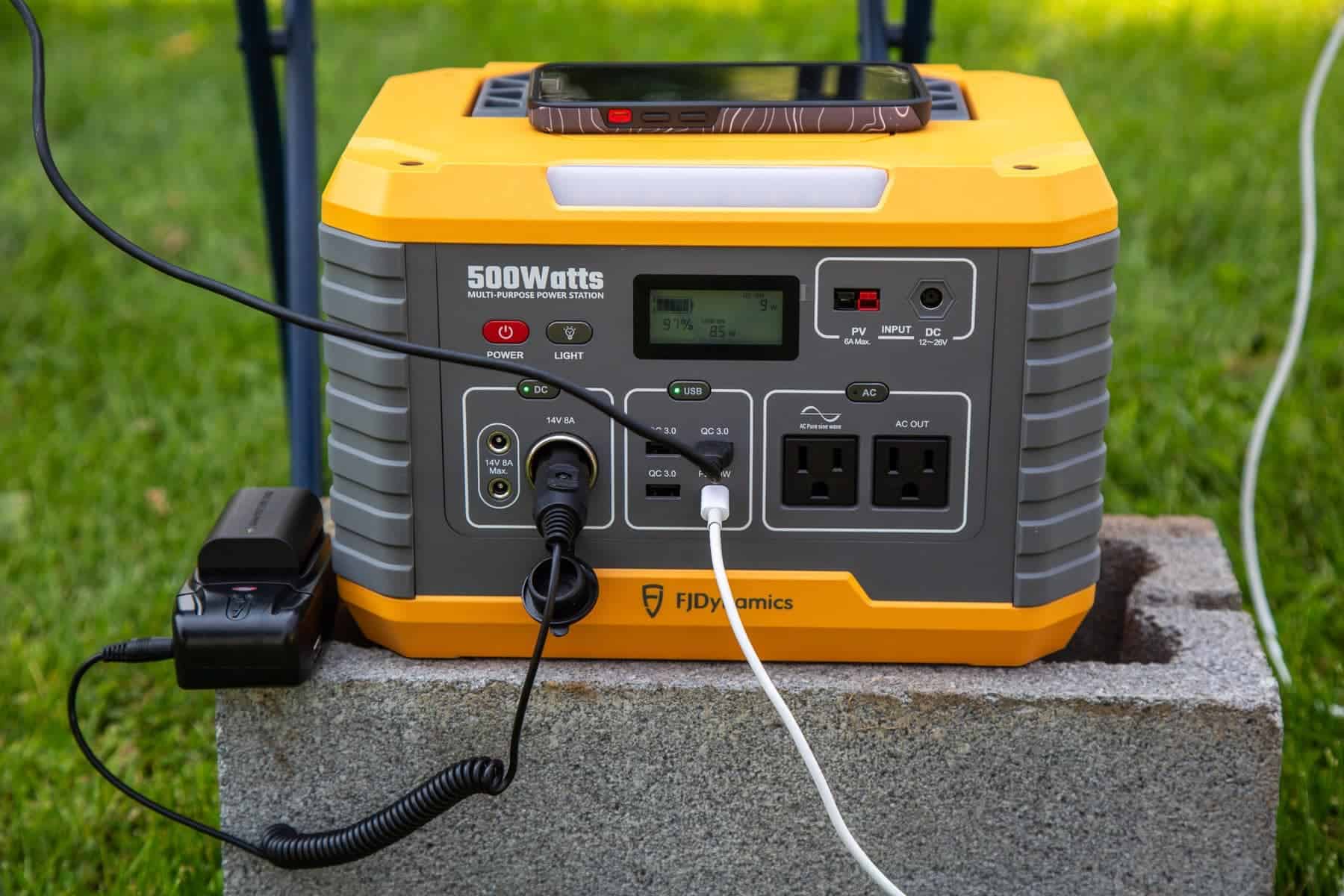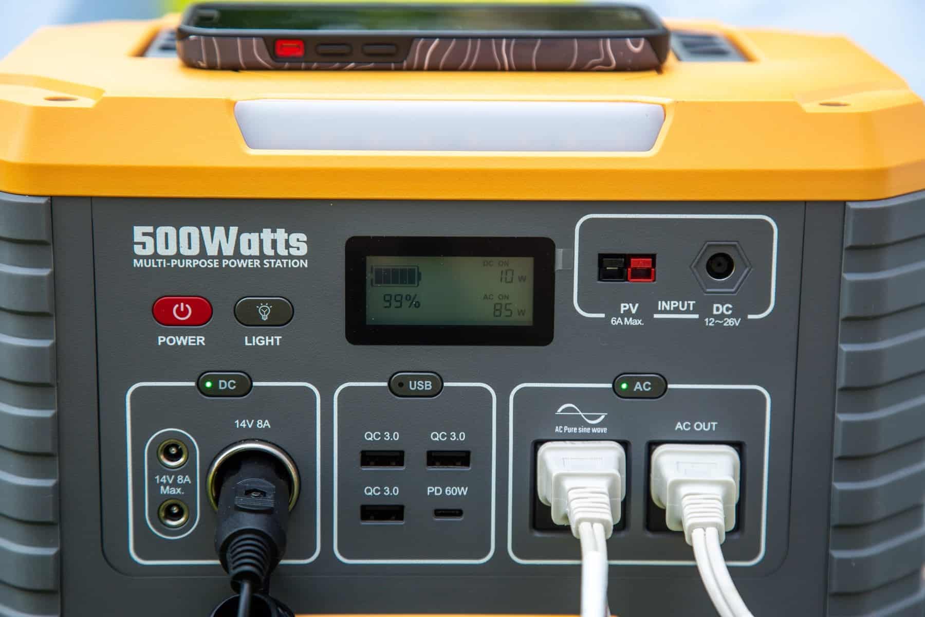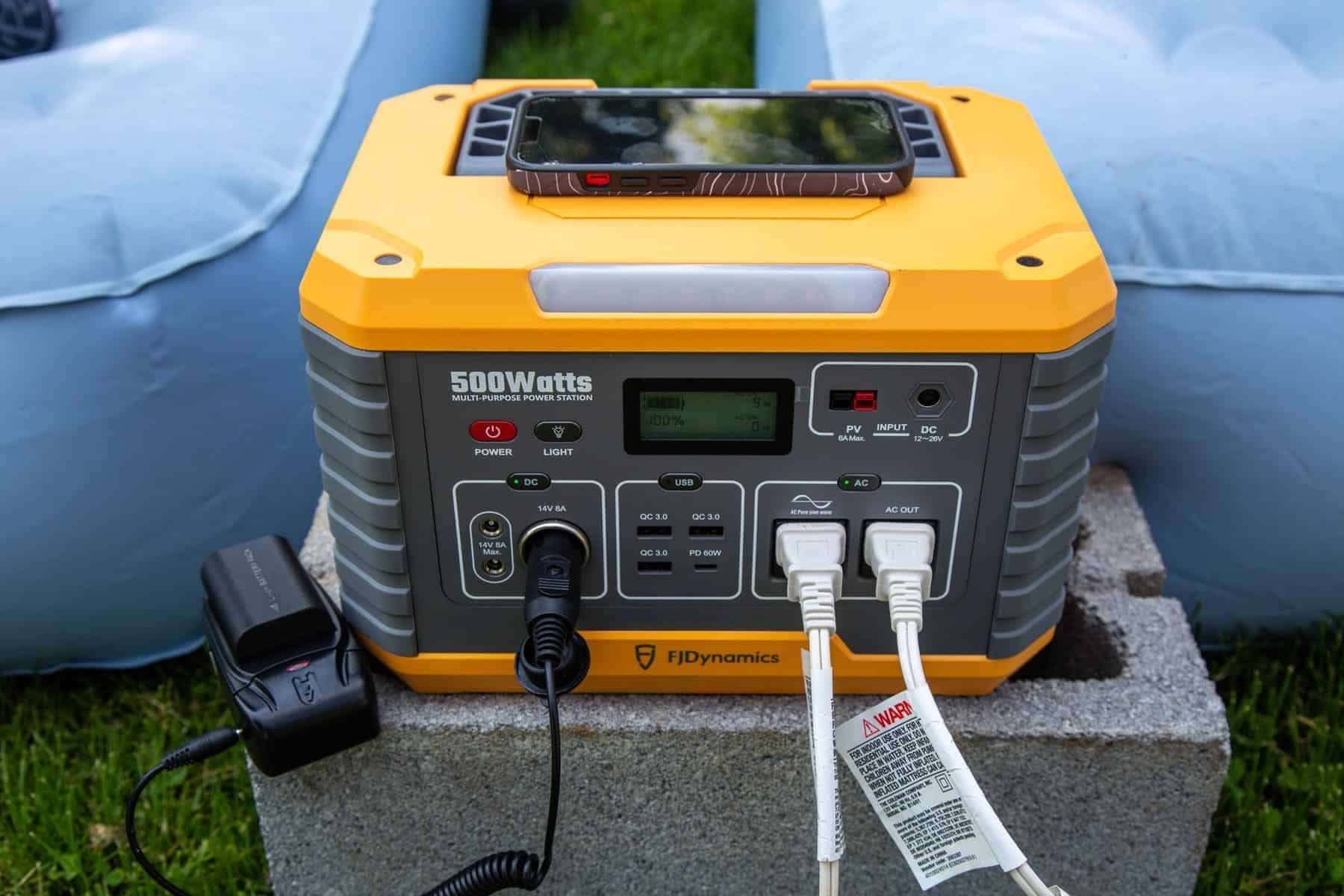 The FJD MP500 was really helpful in charging a variety of devices. We used it to power lamps, blow up air mattresses, and charge a drone, computer, and camera battery. It wasn’t until we started charging the tech that the display showed a drop from a 100% charge.
