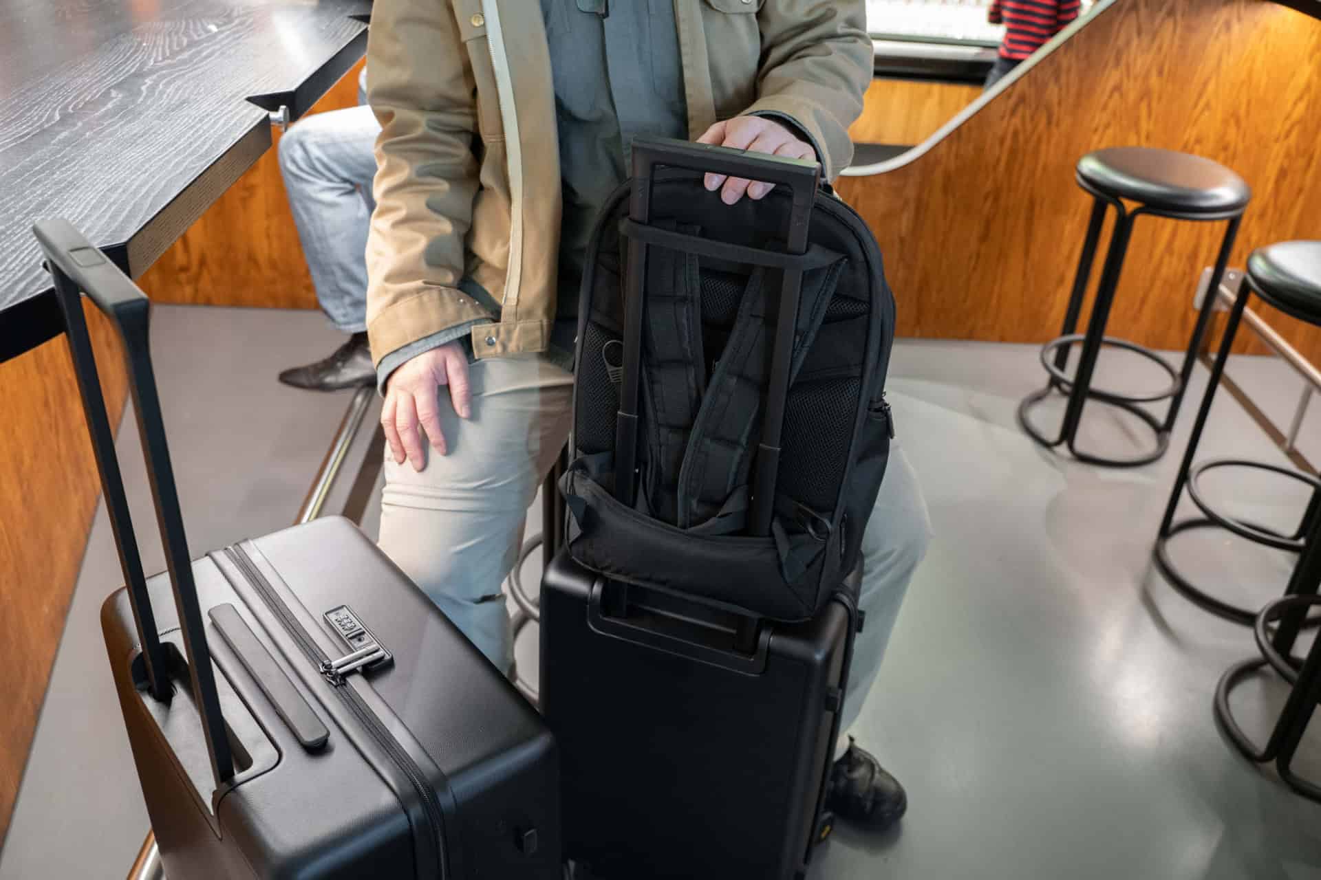This bag is great as a carry-on. It fits right over the handle of the LEVEL8 carry-on trolley suitcase. There are two straps on the back to hook over the trolley handle securely. It adds stability to the trolley that a lot of other travel backpacks don’t do very well.