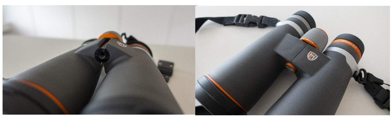 This is where the first issue arises, a design flaw perhaps, where the tripod cap is hard to get at with the wrong adaptor. Maven sells one that works well with it, but 3rd party models might be difficult to screw into these binos.