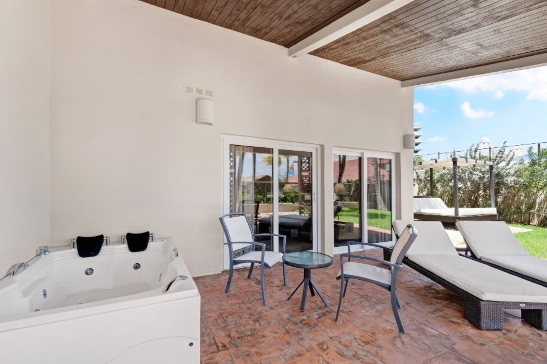 The resort is on Palm Beach and offers loungers and palapas for guests